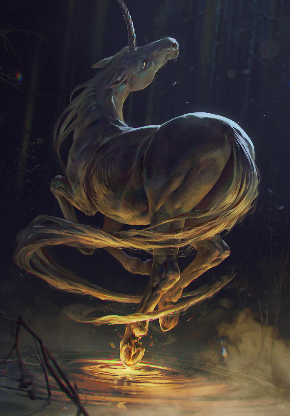 Su aspecto es el de caballos con un único cuerno en medio de la frente. Usan la telepatía para comunicarse entre ellos y, en ocasiones, con otras razas. Los cuernos de unicornio sirven como antídotos universales contra venenos y también pueden ser usados para detectar veneno. El color de su piel va cambiando con la edad.Aunque suele ser espantadizo y temeroso, si se encuentra con una doncella que todavía no haya tenido trato carnal con varón alguno, se le arrima osado y sin ningún temor.